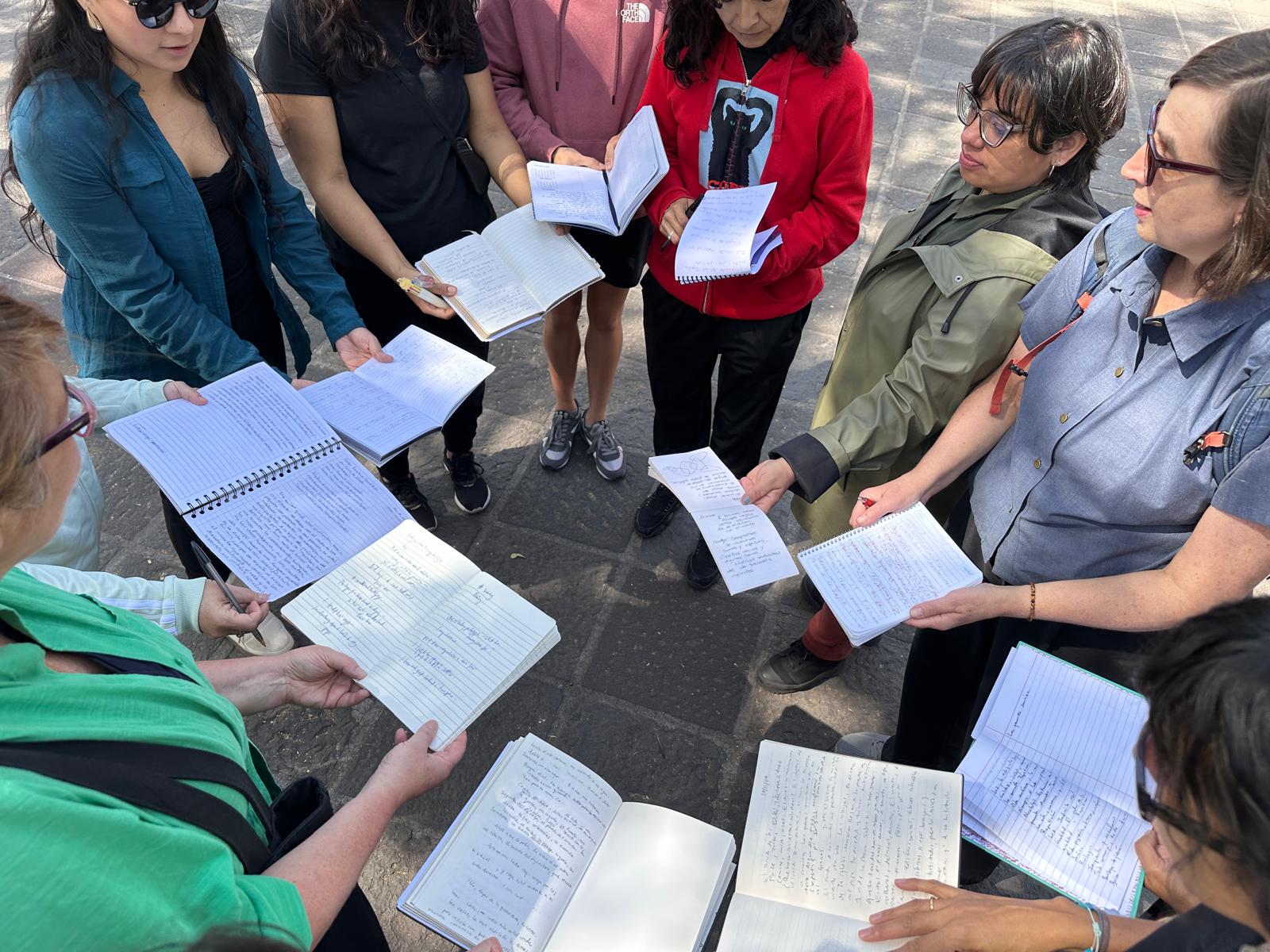 On 18 November 2024, the researchers facilitated a workshop in Mexico City with a group of researchers meeting at Espacio Cero, and writing at the Plaza Coyoacán and Plaza Jardín Hidalgo at the Centre  of Coyoacán. We were kindly hosted by Sara Gómez, Professor of Research Creation at the Center for Dance Research and Documentation José Limón. The workshop was conceived as a way of sharing the ongoing research beginning with a short introduction to the overall project highlighting its basis within language-based artistic research.